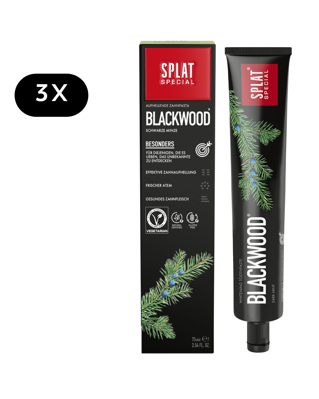 Splat BLACKWOOD zobna pasta 3 × 75 ml – beljenje z aktivnim ogljem, brez fluorida, zaščita dlesni, svež dah, naravno čiščenje z brinovim izvlečkom