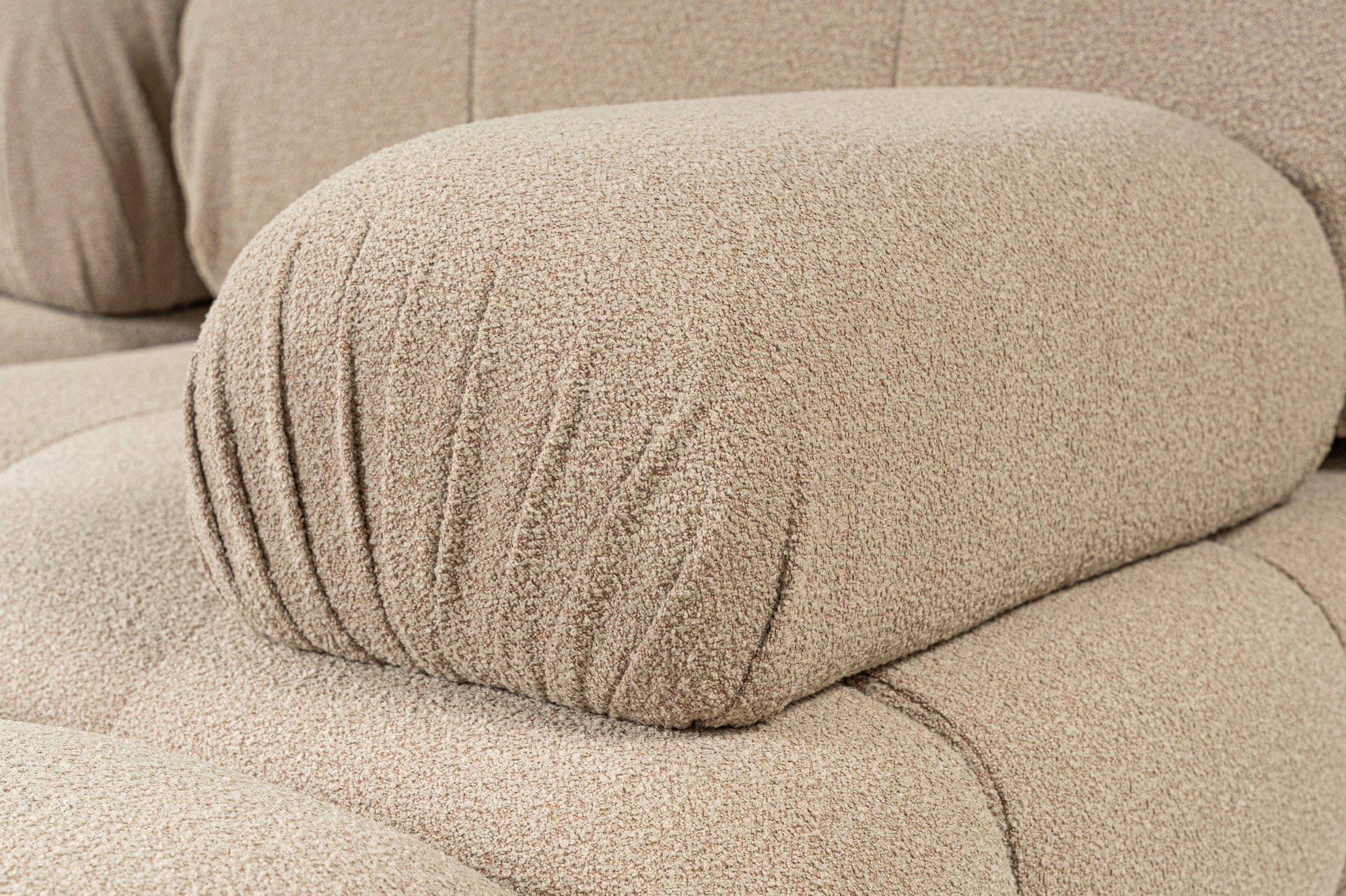 Okvir: BUKOV LES / IVERNA PLOŠČA Tkanina: 100 % POLYESTER 28 DNS pena za hrbet Dolžina: 105 cm Širina: 100 cm Višina: 80 cm Višina sedeža: 45 cm Pena: 28 DNS mehka siva pena / 24 DNS perje / vzmet na sredini Za sedenje 60% rezana pena / 40% silikonska pena za hrbet Sistem: Sistem kavča z mehanizmom za premikanje hrbta in rok Nepremična blazina za sedenje/nepremična blazina za hrbet Tkanina, ki se lahko suho čisti Noge: črne plastične noge