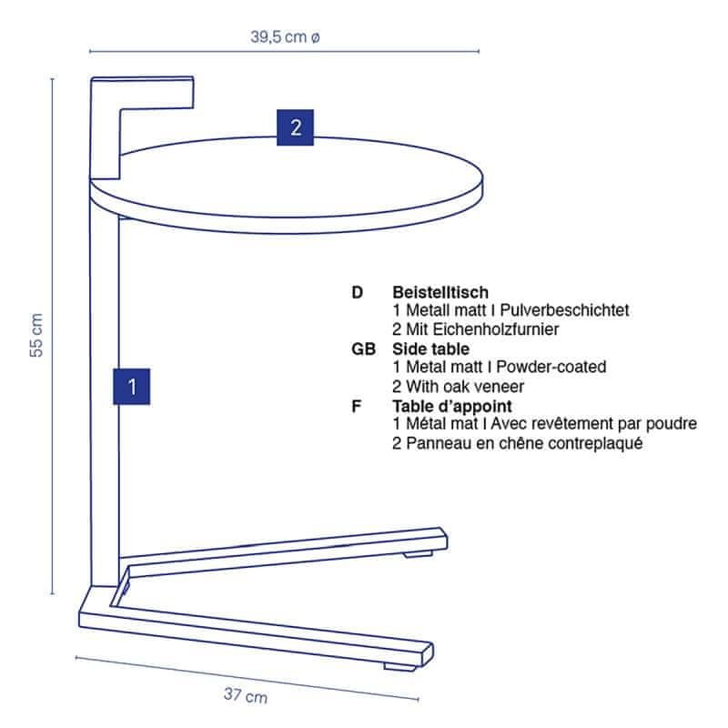 Majhna odlagalna mizica hrast – ta mali pomočnik se lahko uporablja prilagodljivo. Uporabite jo na primer kot majhno mizico za shranjevanje na balkonu ali v dnevni sobi. Okvir mize je izdelan iz kovine s sodobnim mat videzom v črni barvi. Okrogla mizna plošča je izdelana iz hrastovega lesa. Vizualno zelo privlačna in harmonična kombinacija! Višina 55 cm, skupna širina 39,5 cm.Black matirana kovina s hrastovim furnirjem 37 cm, 56 cm h, 39,5 cm