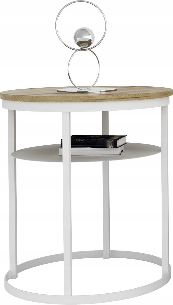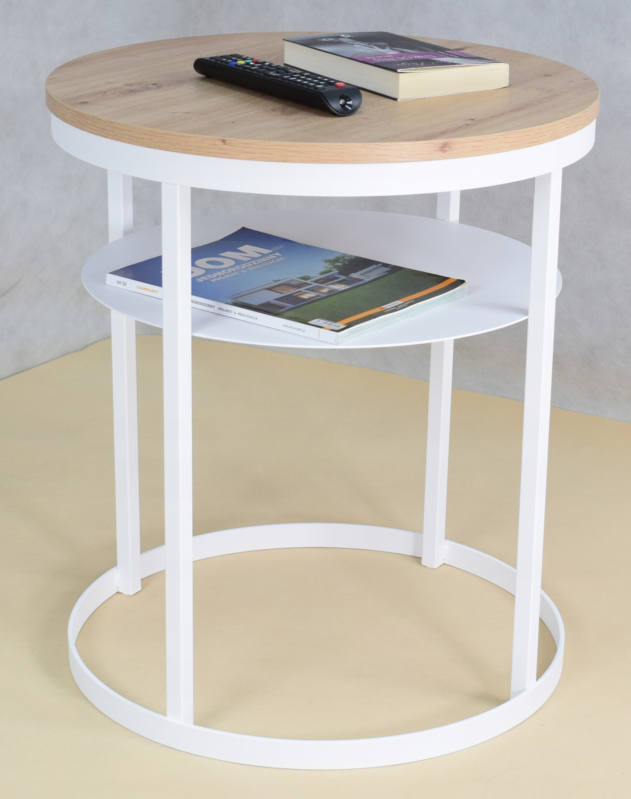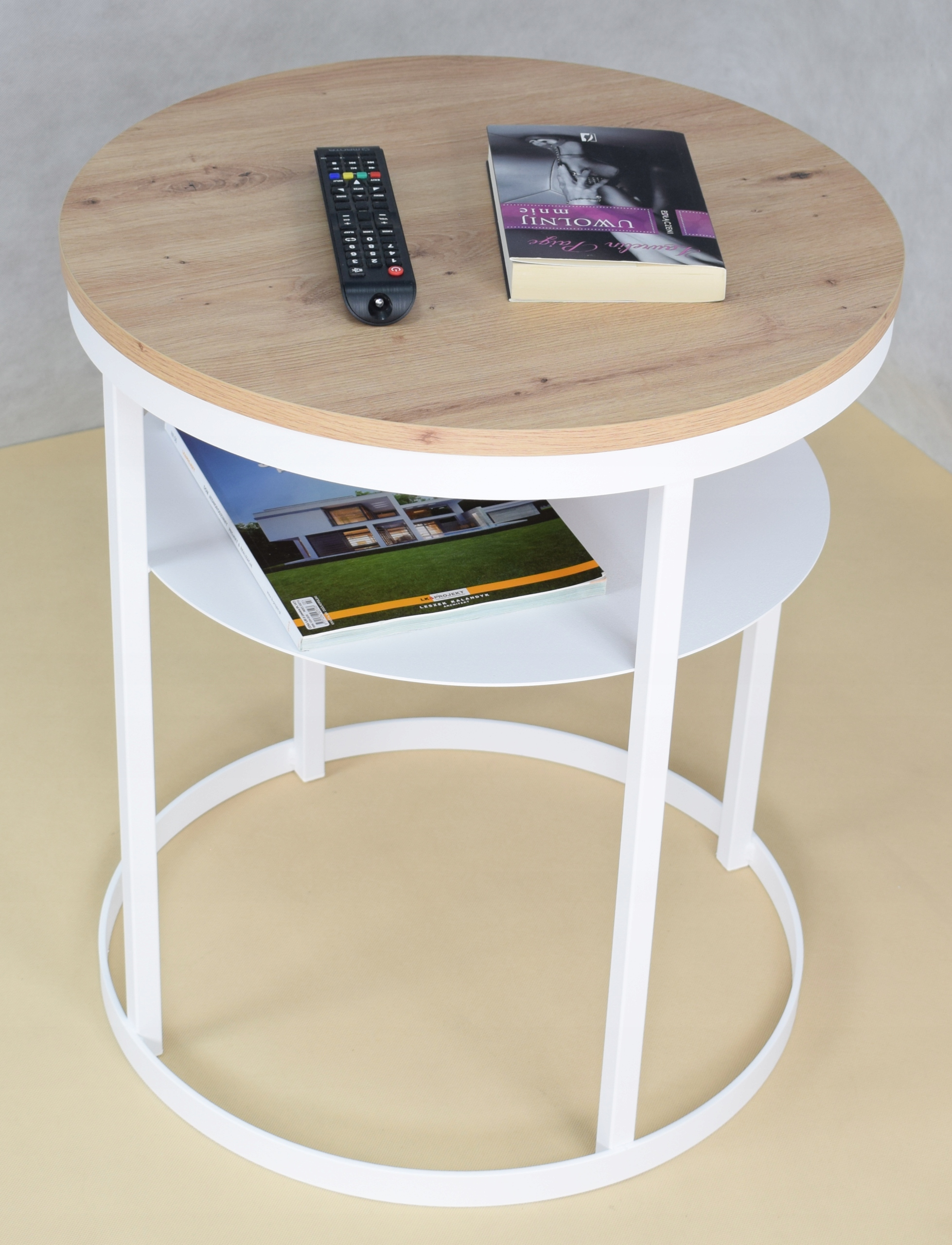 shumee Klubska mizica s polico, okrogla, premer 55, izdelana iz profilov 20x20, mat bela, Artisan Oak