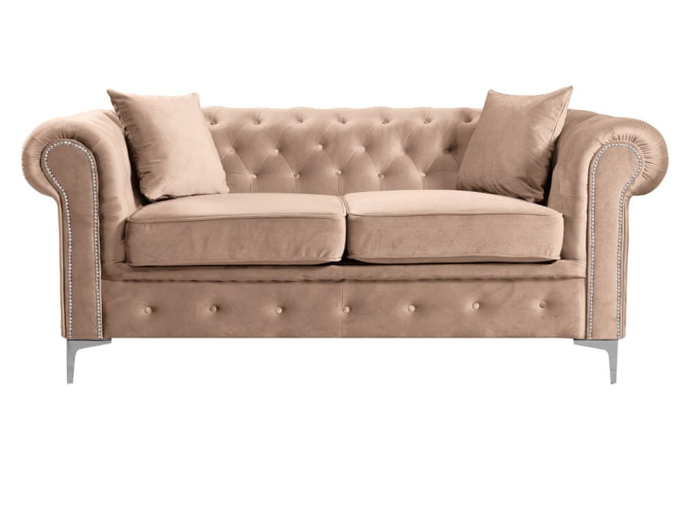 Vnesite v svojo notranjost pridih razkošja z dvosedom ROMANO v stilu Chesterfield, ki navdušuje z eleganco in prefinjenostjo. Oblazinjenje iz svetlo rjavega blaga Velvet 28 z odpornostjo proti obrabi 50.000 ciklov Martindale deluje nežno in prefinjeno. Celotno oblazinjen dizajn omogoča postavitev kjerkoli v prostoru, kjer bo postal nepregleden element. Z dimenzijami (ŠxGxV): 185×88×73 cm zagotavlja udobno sedenje z višino sedišča 46,6 cm, globino sedišča 55 cm in nosilnostjo 120 kg na osebo. Stabilnost zagotavljajo kovinske nogice v srebrni barvi z višino spodnjega prostora 9 cm. Sedežni del je opremljen s polnilo iz vzmeti Falista s trdoto T30 in pritrjen z ježkom za enostavno rokovanje. Bogato prešivanje, ukrivljeni nasloni za roke in srebrni okrasni gumbi poudarjajo eleganten dizajn. Del paketa sta dve okrasni blazini, ki dopolnjujeta luksuzen videz. Dostavljeno v razstavljenem stanju, pripravljeno za enostavno montažo.