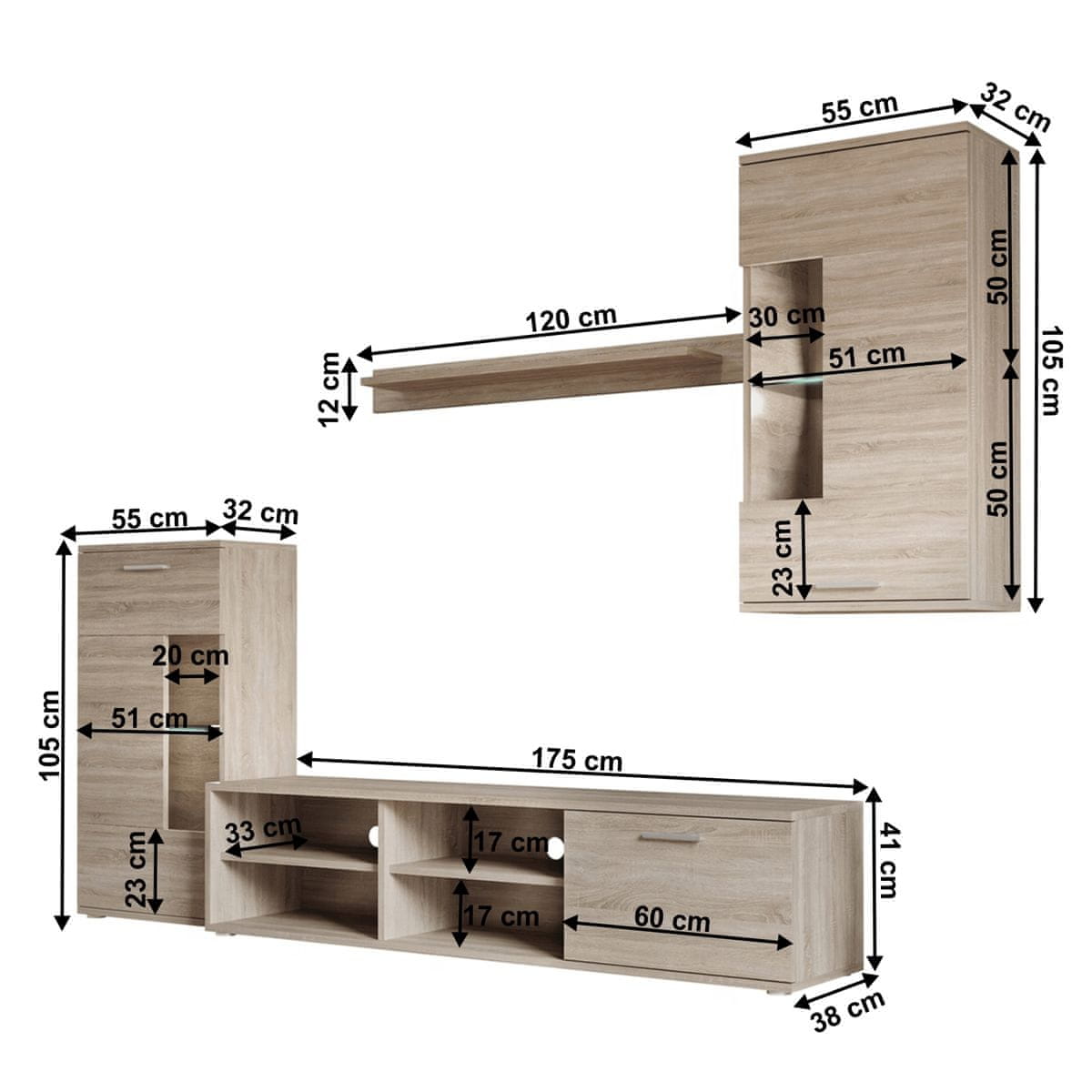 To pohištvo je izdelano iz laminiranega DTD, ki zagotavlja njegovo dolgo življenjsko dobo in odpornost na poškodbe. Kombinacija foliranega DTD in stekla daje živi steni moderen videz, ki se poda v vsak interier. Svetla barva hrasta sonoma prispeva k občutku zračnosti in lahkotnosti v prostoru.