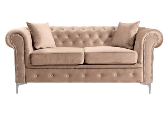 Vnesite v svoj interier plemenitost z dvosedom ROMANO, ki bo pritegnil pozornost na prvi pogled. Oblazinjenje iz svetlo rjavega blaga Velvet 28 z odpornostjo proti obrabi 50.000 ciklov Martindale daje nežen sijaj in luksuzen pridih. Celotno oblazinjena izvedba omogoča postavitev kjerkoli v prostoru, medtem ko dizajn v stilu Chesterfield poudarjajo ukrivljeni nasloni za roke, bogato prešivanje in srebrni okrasni gumbi. Z dimenzijami (ŠxGxV): 185×88×73 cm zagotavlja udobno sedenje z višino sedišča 46,6 cm, globino sedišča 55 cm in nosilnostjo 120 kg na osebo. Stabilnost zagotavljajo kovinske nogice v srebrni barvi z višino spodnjega prostora 9 cm. Sedežni del s polnilom iz vzmeti Falista in trdoto T30 je pritrjen z ježkom za enostavno manipulacijo. Praktična raztegljiva funkcija ustvari ležišče s površino 113×190 cm, idealno za nepričakovane obiske. Zraven sta priloženi dve okrasni blazini, ki dopolnjujeta celoten luksuzen videz. Dostavljeno v razstavljenem stanju, pripravljeno za enostavno montažo.