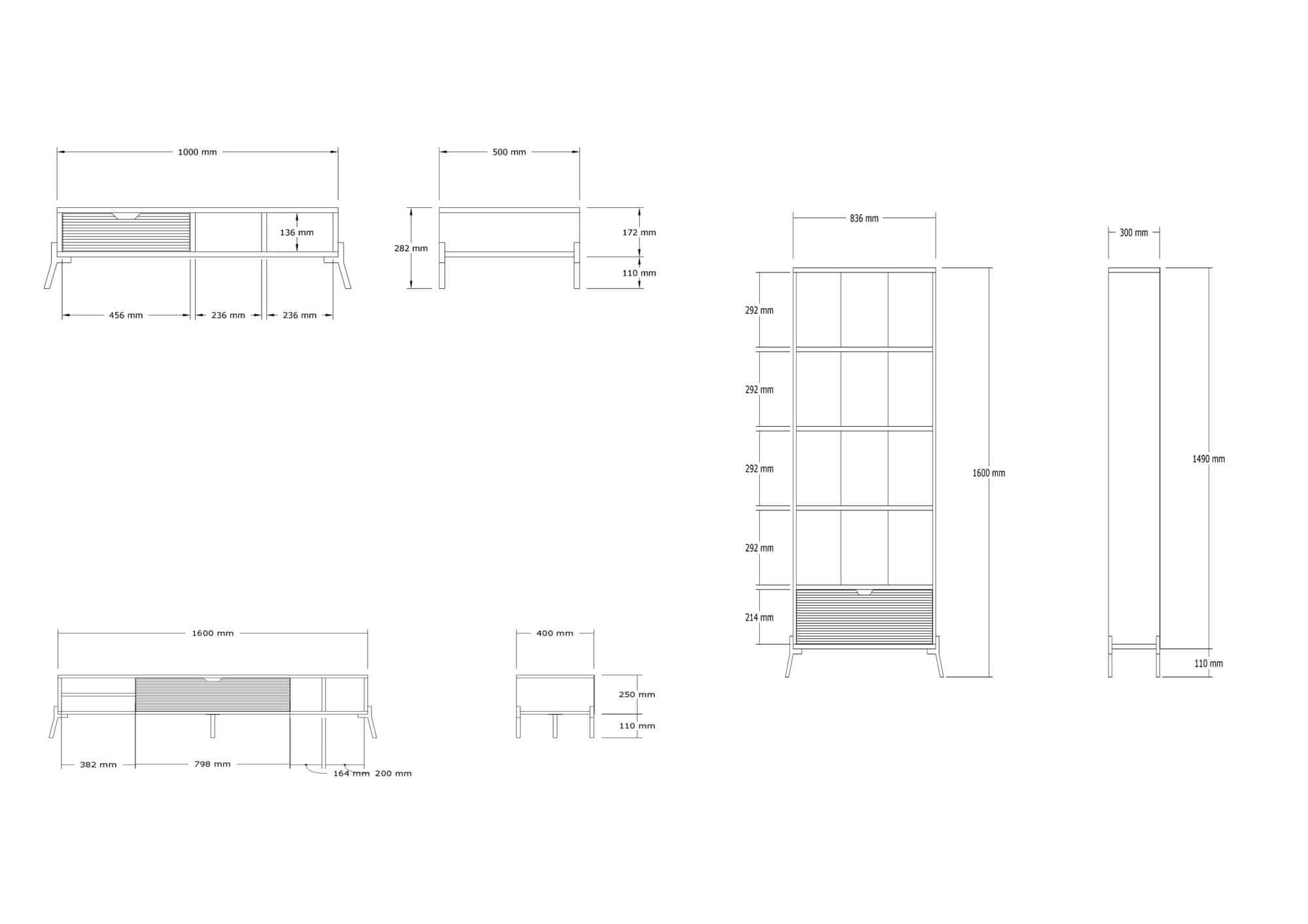100 % MELAMINSKO PREVLEČENA IVERNA PLOŠČA Debelina: 18 mm Stojalo za TV: Širina: 160 cm Višina: 36 cm Globina: 40 cm Knjižna polica: Širina: 83,6 cm Višina: 160 cm Globina: 30 cm Miza za kavo: Širina: 100 cm Višina: 28,2 cm Globina: 50 cm