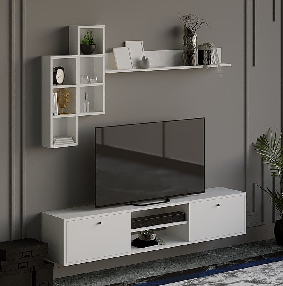 100% IVERNA PLOŠČA PREVLAČENA Z MELAMINOM TV stojalo: Širina: 180 cm Višina: 35 cm Globina: 35 cm Stenska polica: Širina: 25 cm Višina: 70 cm Globina: 15 cm (2 kosa) Stenska polica: Širina: 130 cm Višina: 15 cm Globina: 15 cm Številne police Lahko se pritrdi na steno Dodatna shramba Število paketov: 2 190 × 41 × 11 cm / 31 kg (1 kos) 68 × 37 × 12 cm / 9 kg (1 kos)