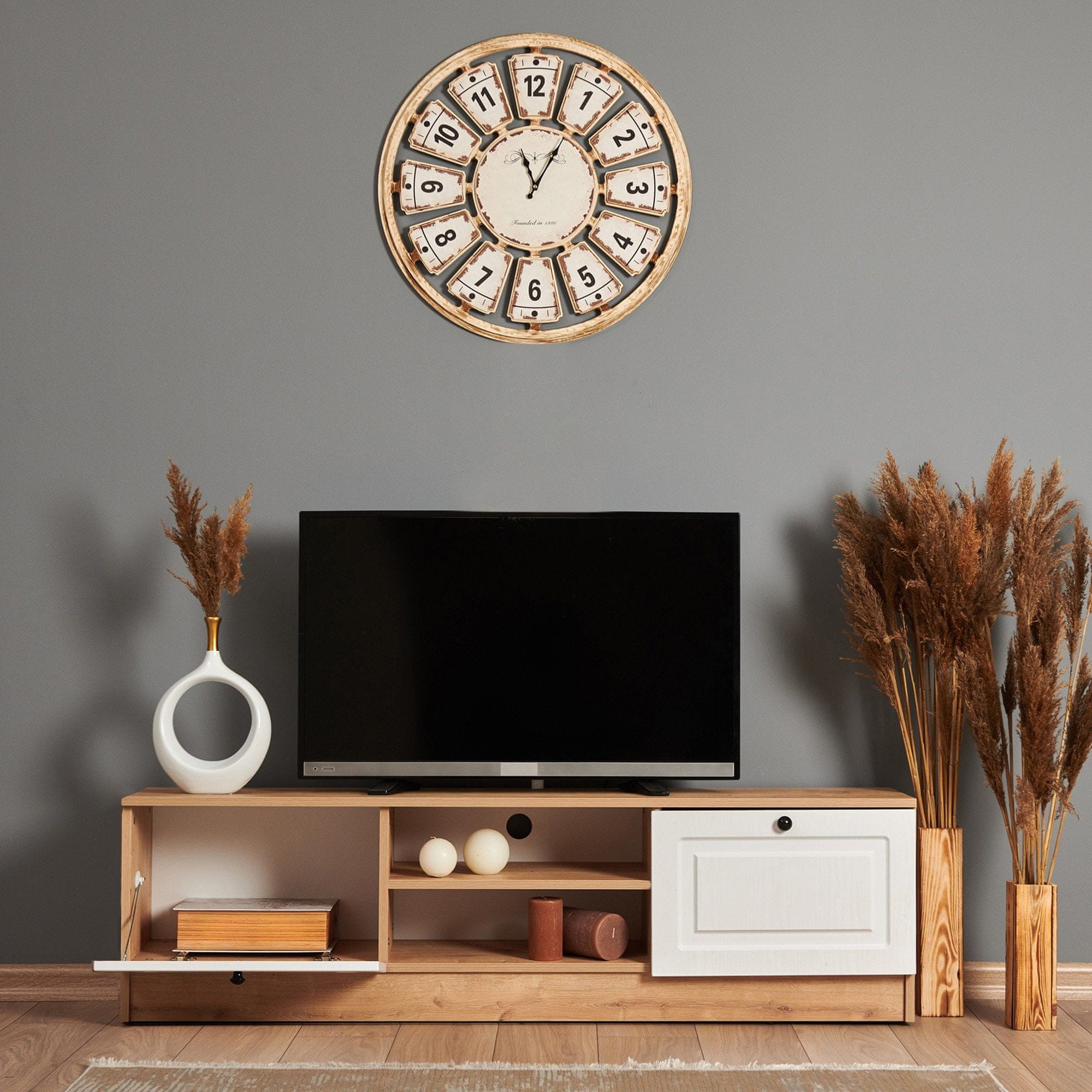 100 % MELAMINSKO PREVLEČENA IVERNA PLOŠČA Debelina: 18 mm Robovi na korpusu: 0,8 mm Širina: 159,8 cm Višina: 45 cm Globina: 34 cm Vrata iz MDF z 0,35 mm membransko prevleko iz jesena Enostavna montaža s sistemom Minifix Nepremični tečaji 2 vrata Številne police