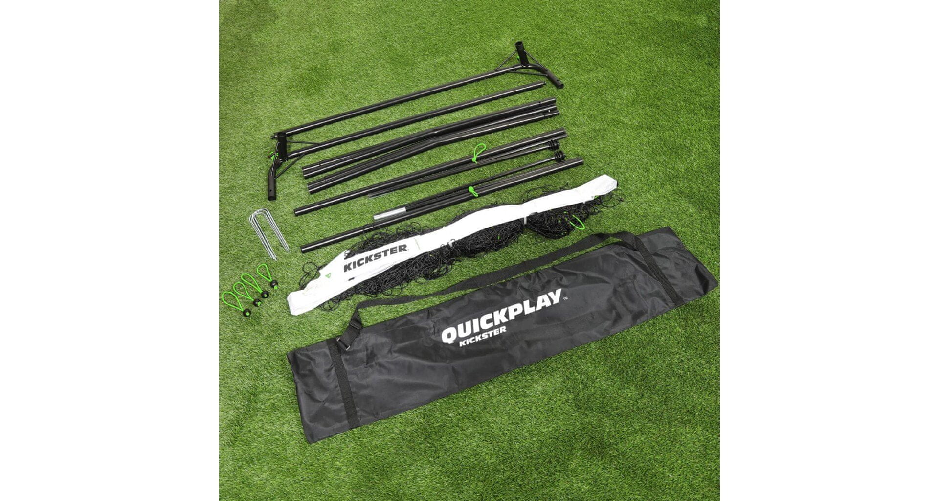 Blagovna znamka Quickplay predstavlja vrsto nogometnih golov za trening Kickster. Ta nogometni gol je zaradi svoje zasnove enostavno zložljiv, s priloženo torbo pa ga lahko enostavno shranite in prenašate med treningi. Gol Kickster je primeren za individualne treninge doma in za nogometne klube. Zasnovan je tako, da je trpežen in prenosljiv s patentiranim sistemom FLEXI POST, ki v okvirju uporablja kombinacijo jekla in steklenih vlaken, skupaj s prilagodljivo prečno palico iz blaga in sistemom palic. Cilj vključuje zatiče za pritrditev v tla – material: jeklo in steklena vlakna. PE – mere: 300 × 200 × 110 cm – teža paketa: približno 9 kg – mere paketa: 120 × 22 × 15 cm – enostavna in hitra montaža.