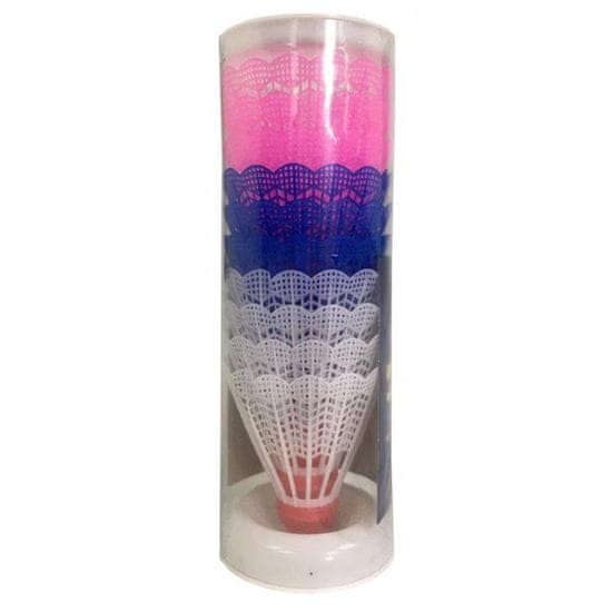 Set večbarvnih žogic za badminton. Izdelane so iz najlona in so namenjene rekreativnim igralcem in za namene treninga. V pakiranju je 10 kosov – 3 rožnati, 3 modri in 4 beli.