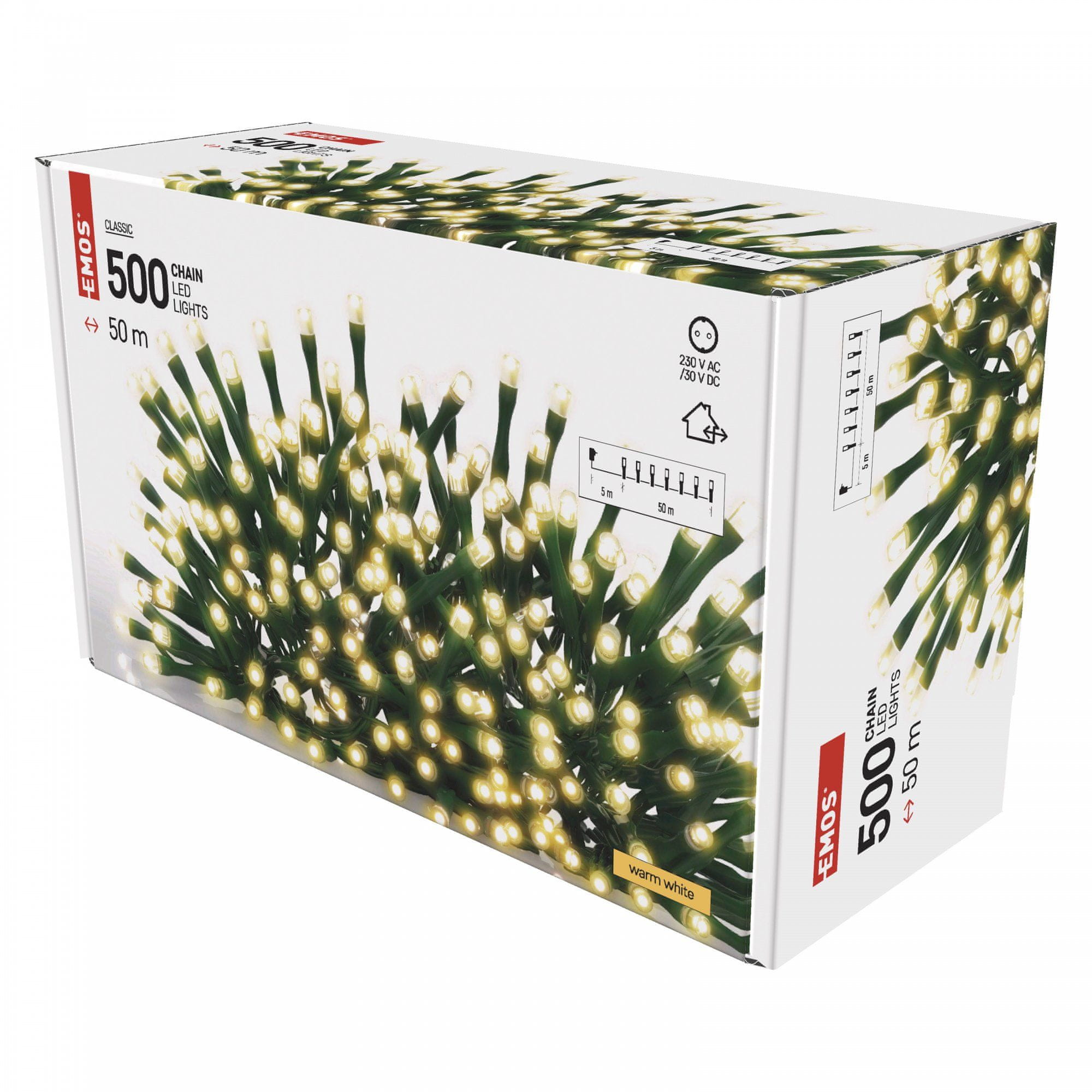 Dolžina svetlobne verige meri 50 metrov, na njej pa je500 LED žarnic, ki svetijo v toplo beli barvi. Primerna je tudi za zunanjo uporabo, zato z njo lahko okrasite drevesa na vrtu.