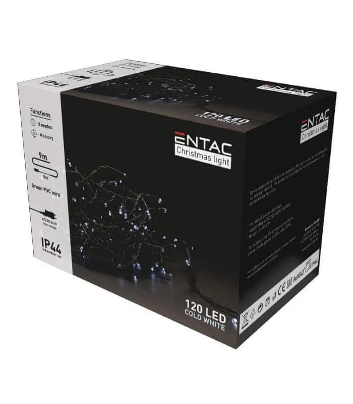Dolžina: 9 mIP razred: IP44Barva: hladno belaBarvna temperatura: 6400 KŠtevilo LED: 120 kosovVodilna žica: 5 mNapajanje: 220–240VVrsta žice: zelena PVC žicaČasovnik: neFunkcije: spomin, 8 funkcij osvetlitve