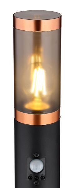Zunanja stoječa svetilka s senzorjem Globo Boston 3159BCS iz nerjavečega jekla v brezčasni črni barvi z elegantnim dodatkom bakra. Razred zaščite IP44. Celoten opis