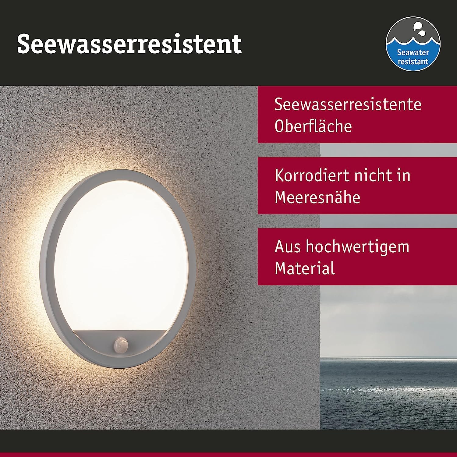 Zunanja stenska svetilka Paulmann Lamina je enostavnega, klasičnega videza in se zlahka prilega na vse stene hiš in podobnih objektov. Ohišje je izdelano iz nerjavnega jekla, ki zagotavlja vzdržljivost, senčilo pa iz robustne umetne mase. Zahvaljujoč stopnji zaščite IP44 je svetilka zaščitena pred vdorom prahu in brizganjem vode iz vseh smeri. Opremljena je s senzorjem gibanja. Vgrajen LED svetlobni vir zagotavlja učinkovito osvetlitev stene, vhoda ali dovozne poti ter zagotavlja prihranek energije.