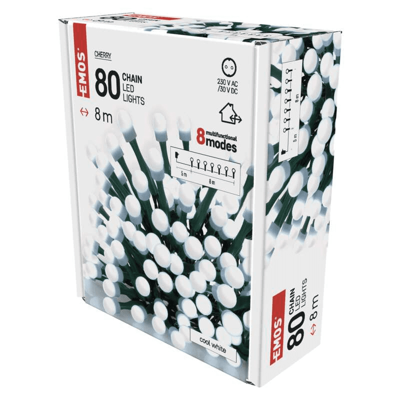 Božična lučke znamke EMOS primerne za notranjo in zunanjo uporabo v obliki LED verige. Veriga je dolga 8 m, vsebuje 80 LED žarnic.