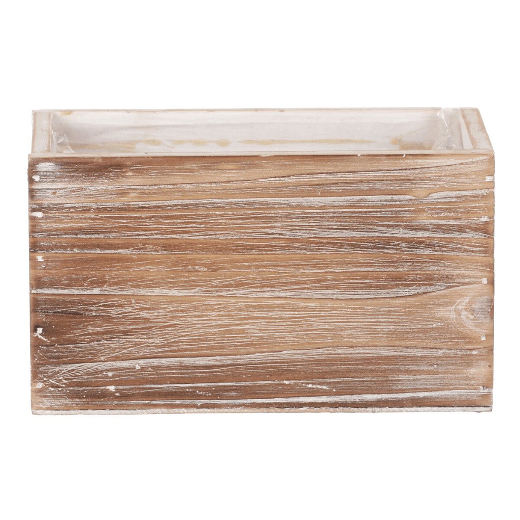 Ta dekorativna lesena cvetlična škatla ima pravokotno obliko in je odličen način, da v svoj prostor dodate eleganten naravni element. Je idealen dodatek za ljubitelje rustikalnega sloga. Njen videz bo odlično izstopal v koči, brunarici ali v notranjosti z naravnimi motivi in materiali. Njen rustikalni videz in naravna barva v prostor vneseta občutek topline in udobja. Čudovit lesni vzorec na površini doda škatli estetsko vrednost. Sestavni del izdelka je zaščitni plastični vložek, ki preprečuje pronicanje vode in tako dolgoročno ustvarja bolj vlažno okolje za rastline.