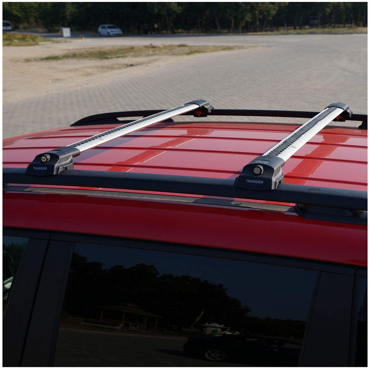 Novo, nizka linija Strešni nosilci Thunder TRX1, nameščeni med klasične ograje.