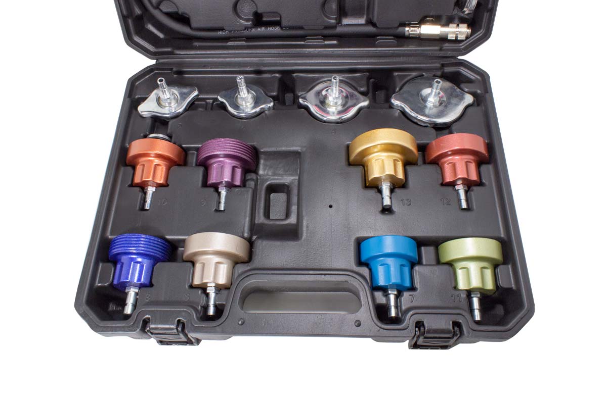 Komplet se uporablja za preverjanje in puščanje hladilnih in grelnih sistemov osebnih avtomobilov, kombijev in tovornjakov.