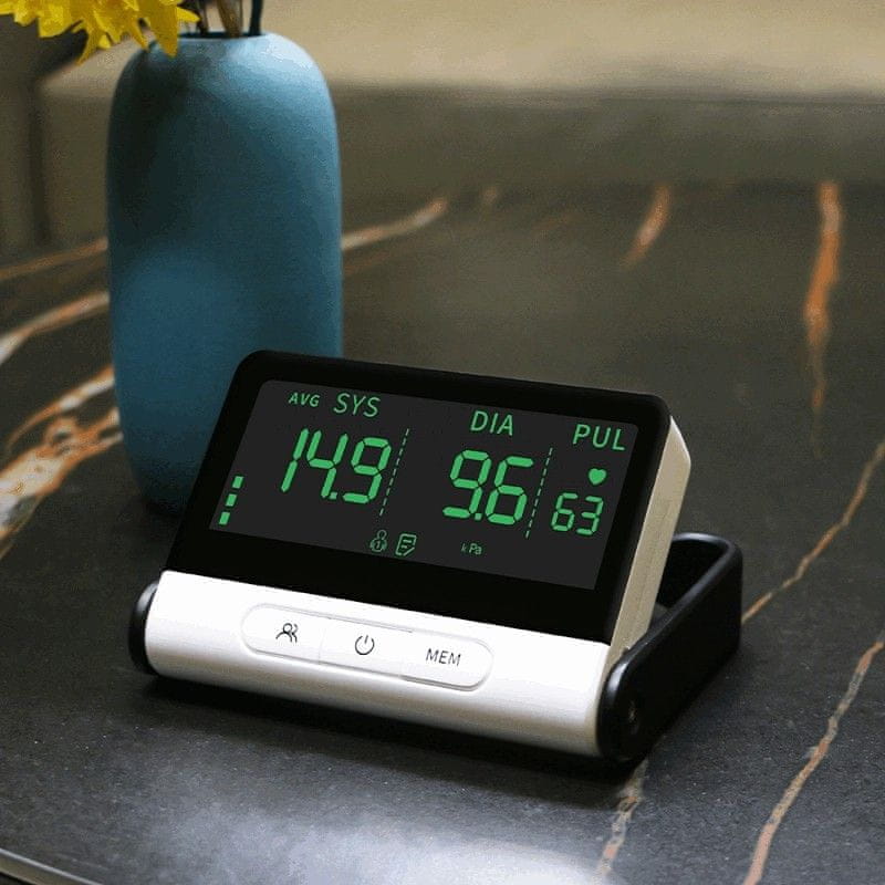 Zaradi treh velikih gumbov in velikega zaslona imate takoj pregled vseh pomembnih informacij. Pomnilnik za 99 meritev, in to za dve osebi.