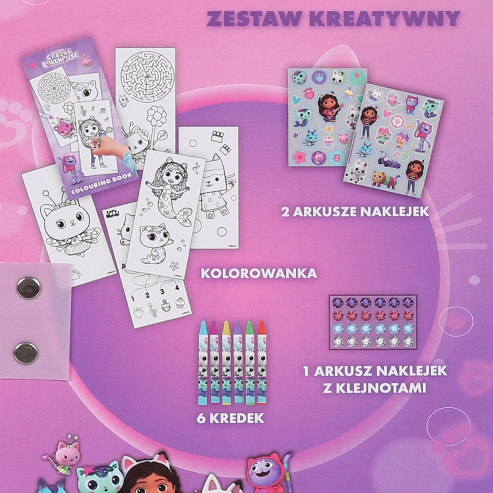 Gabby's Dollhouse (Gabijina mačja hišica) creative coloring set je popolno darilo za vse male umetnike od 3. leta starosti dalje.Komplet vsebuje pobarvanko, 6 voščenih barvic različnih barv, srebrne nalepke in 24 barvnih diamantov za ustvarjanje edinstvenih umetnin.Vse je v priročnem kovčku v obliki Celoten opis