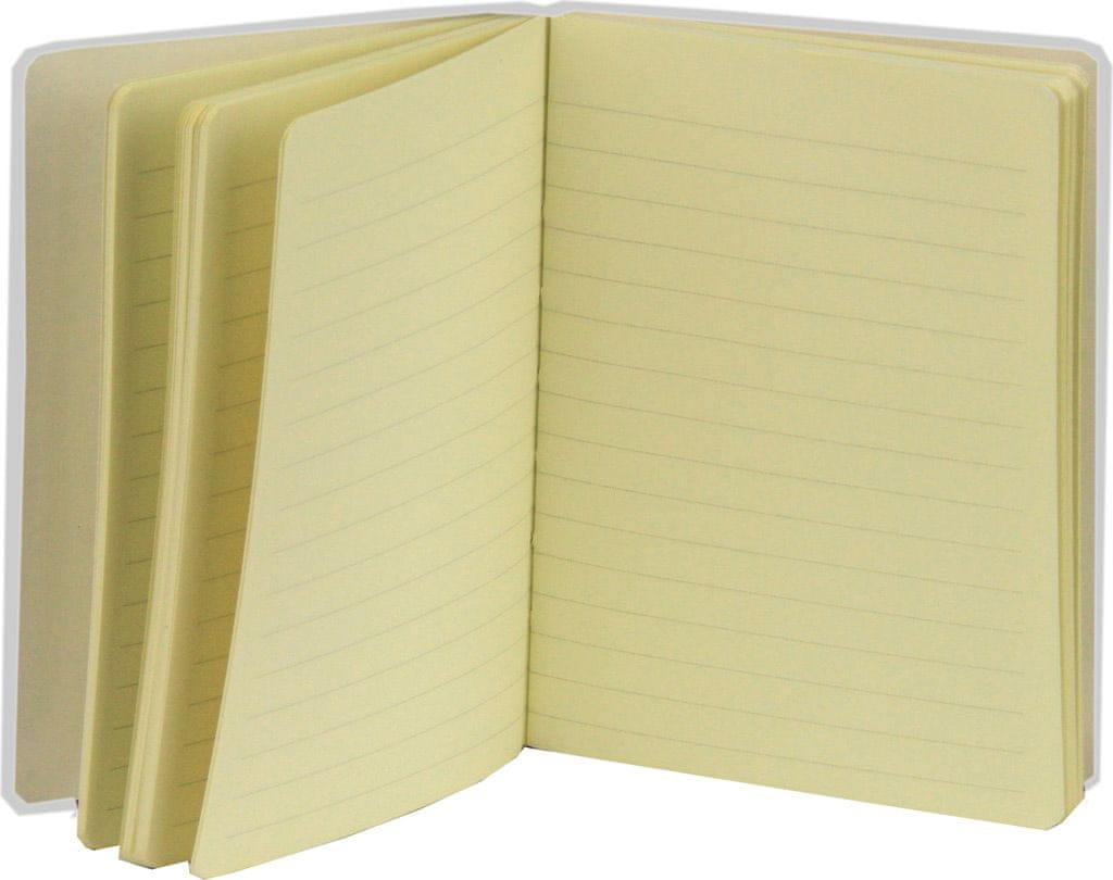 Notes – beležka s trdimi platnicami in elastiko za zapiranje ima 96 črtastih listov krem barve. Velikost zvezka je 9×14 cm, gramatura papirja je 80 g/m2. Vsebuje tudi tekstilno kazalo. Celoten opis