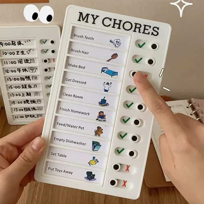 Na papir napišite ali narišite obveznosti in naloge, papir vstavite v označevalnik ter po opravljeni dejavnosti premaknete gumb, da se prikaže kljukica! Ko porabite vse papirje, lahko enostavno dokupite nove. Lahko jih tudi prilagodite vašim potrebam. Celoten opis