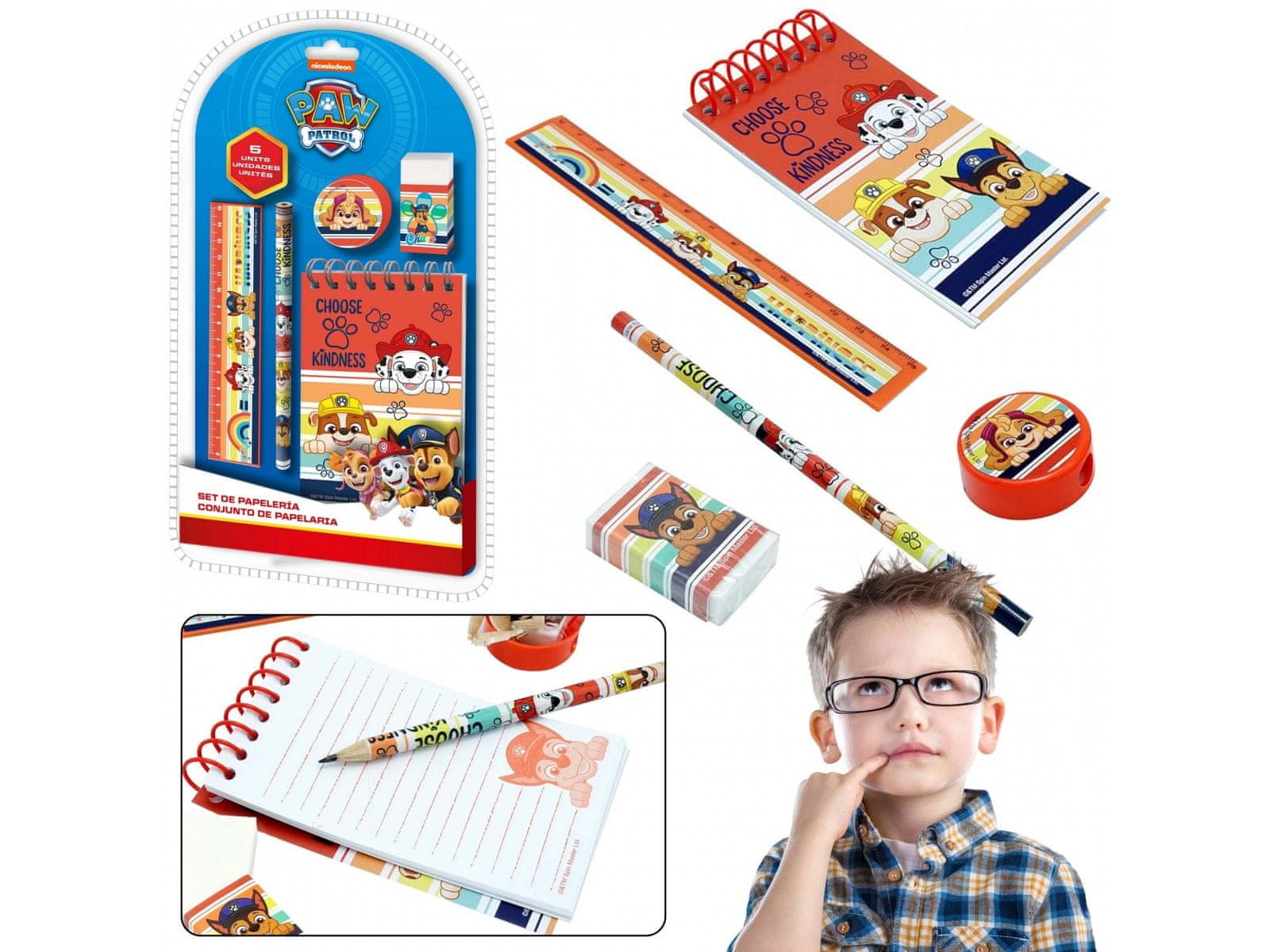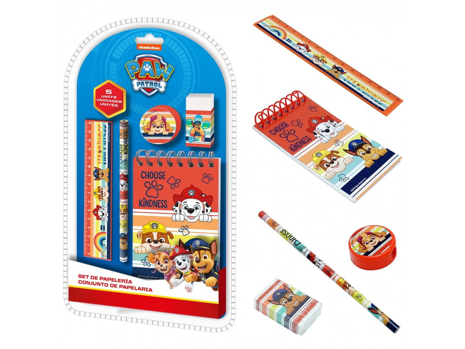 Komplet vsebuje beležko, svinčnik, ravnilo, šilček in radirko, vse okrašeno s pisanimi podobami junakov Psi Patrol.