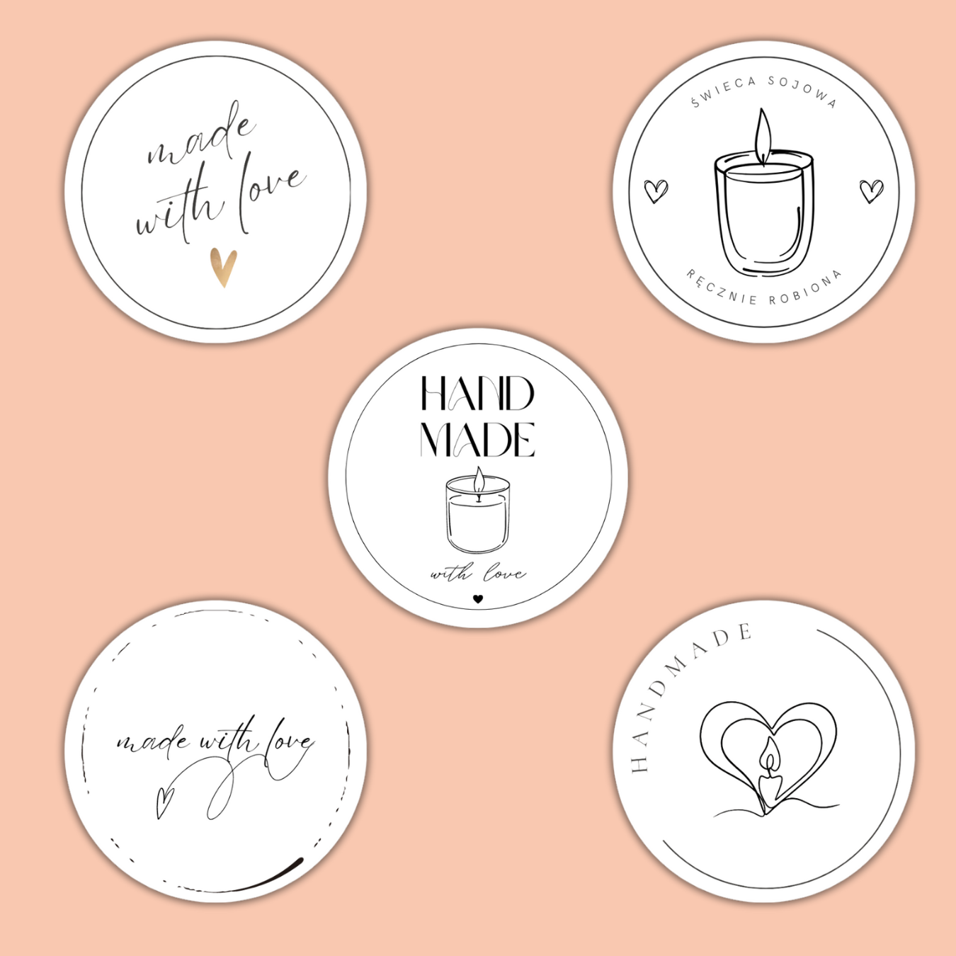 Naše nalepke »Narejeno z ljubeznijo« ponujajo edinstven način za razlikovanje vaših izdelkov. Sporočite svojim strankam, da je vsaka sveča ustvarjena s strastjo in osebnim pristopom.
